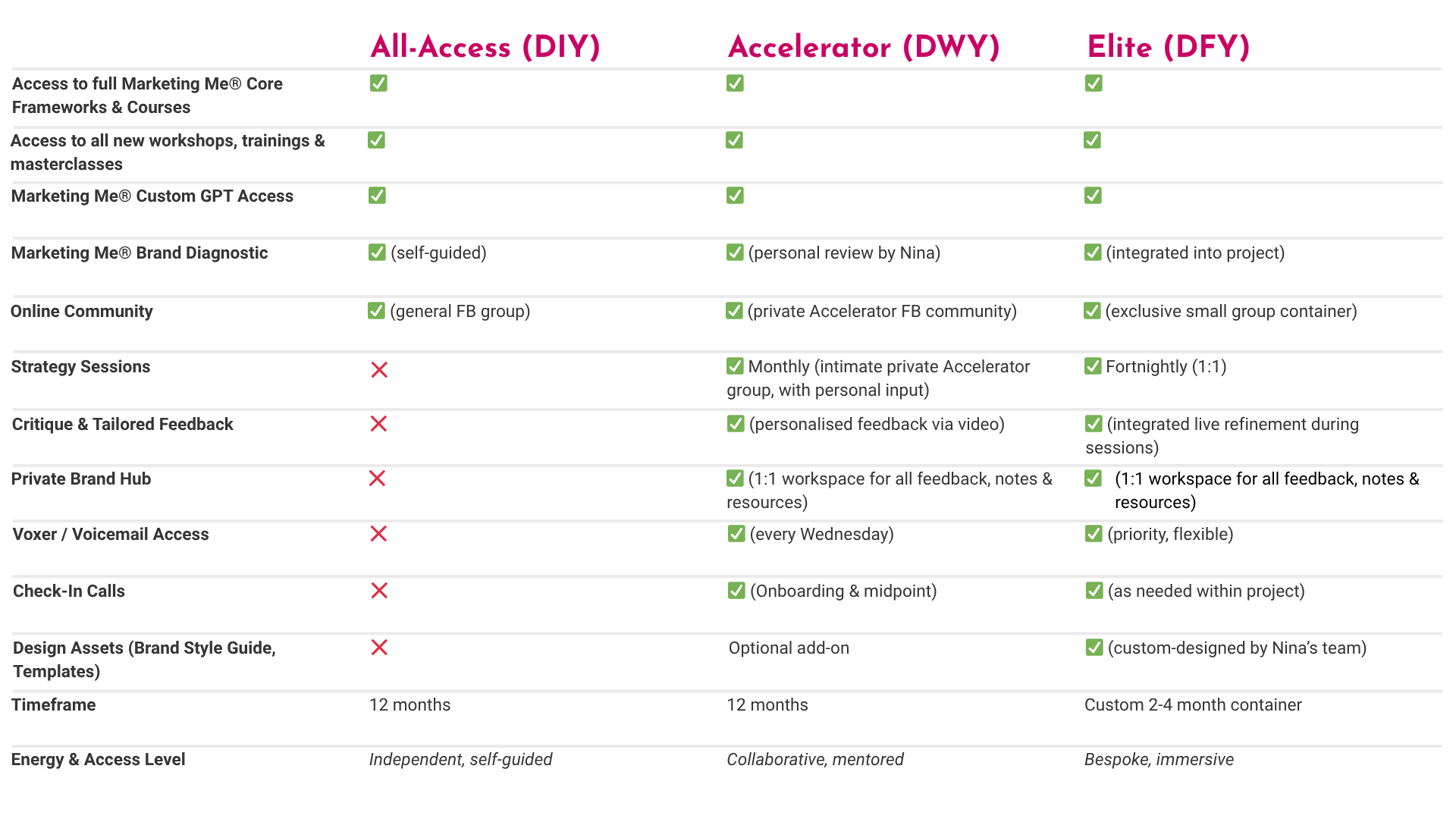 Inside Marketing Me®, your pathway determines how we work together — whether through guided online modules, personalised mentorship, or done-for-you collaboration. All follow the same powerful foundation