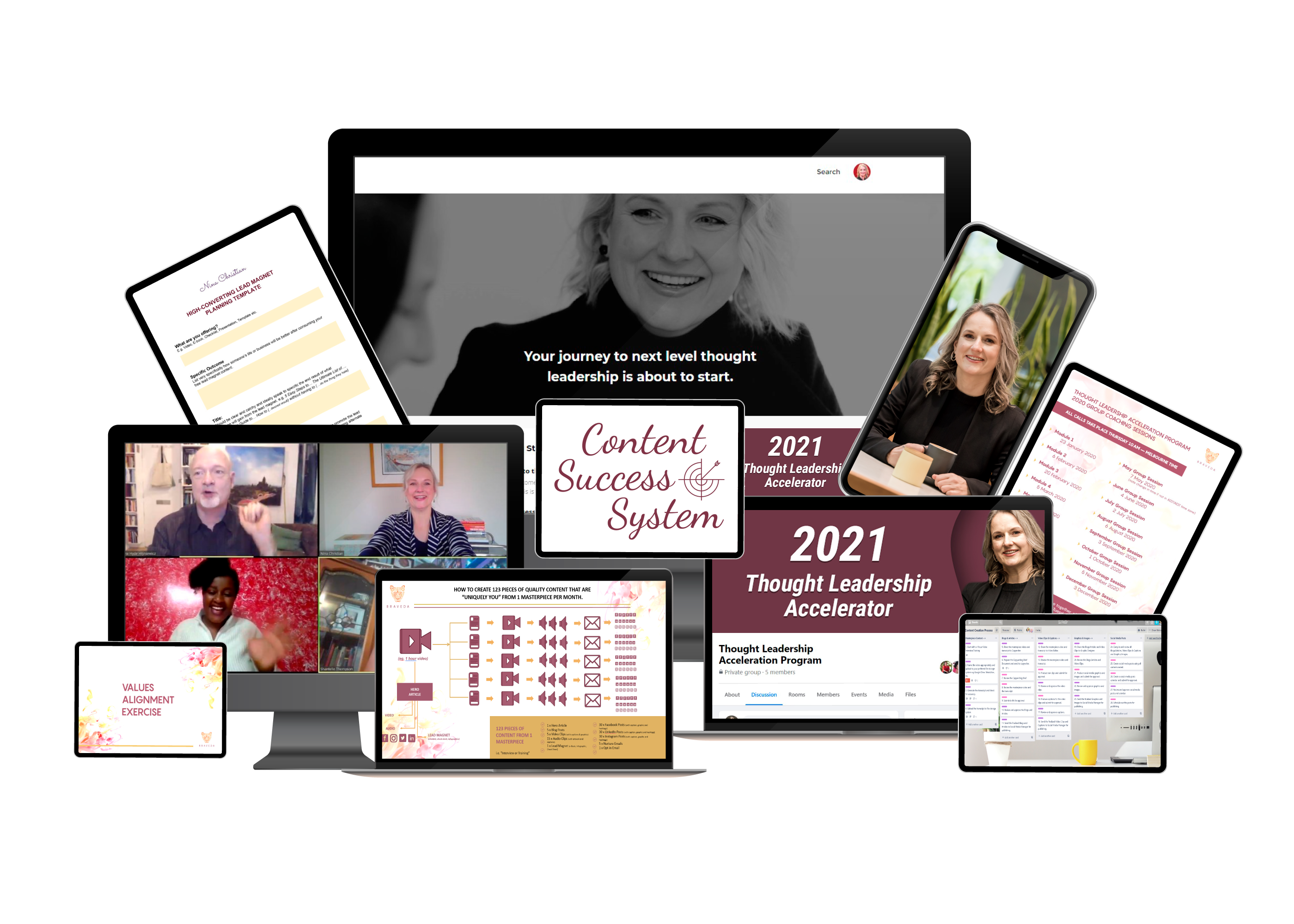 A 90-Day Program that will show you how to create a content system specifically for the purpose of building thought leadership, that will position you as the #1 choice in your industry, without having to pay for ads or work yourself to burnout!